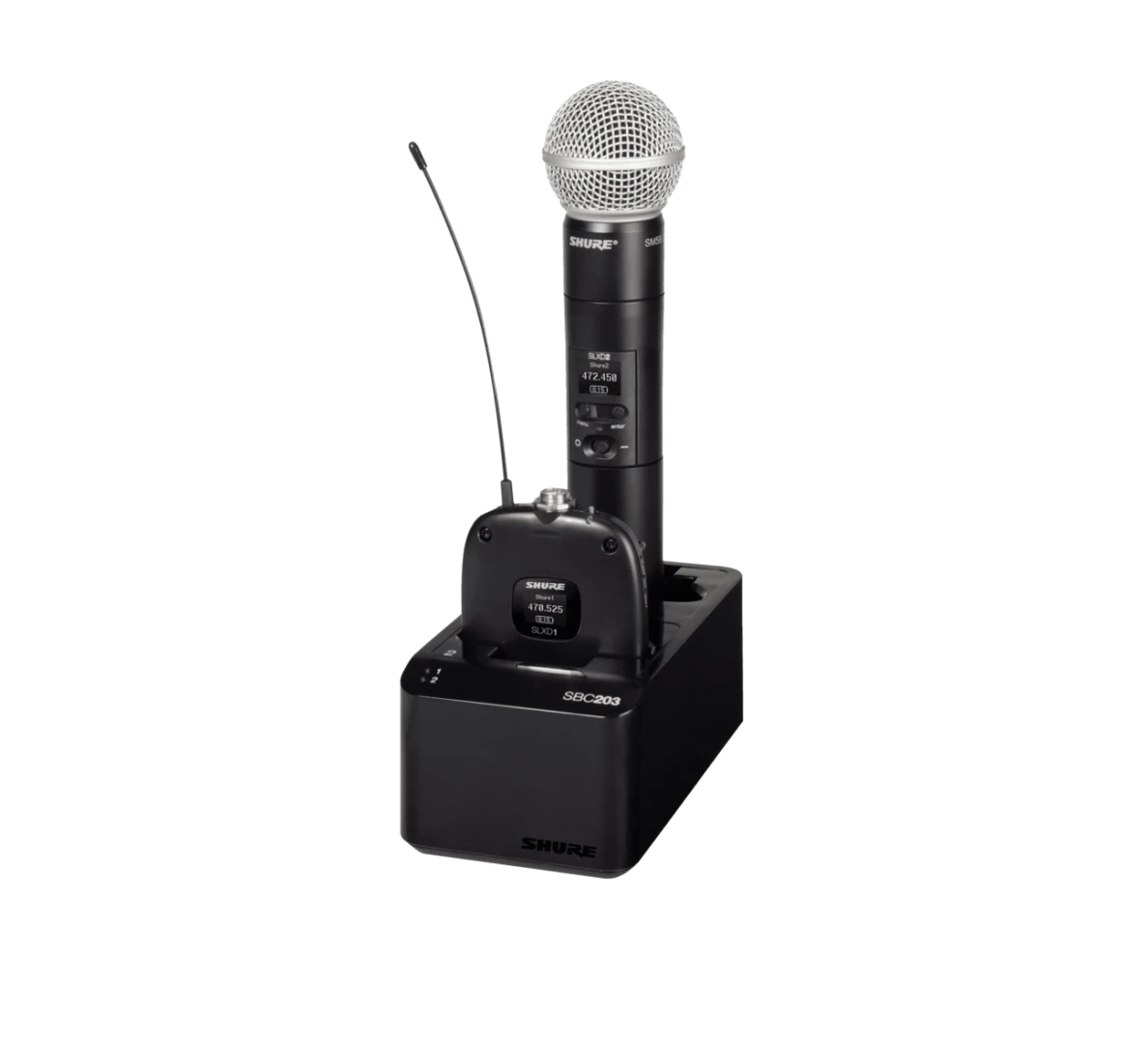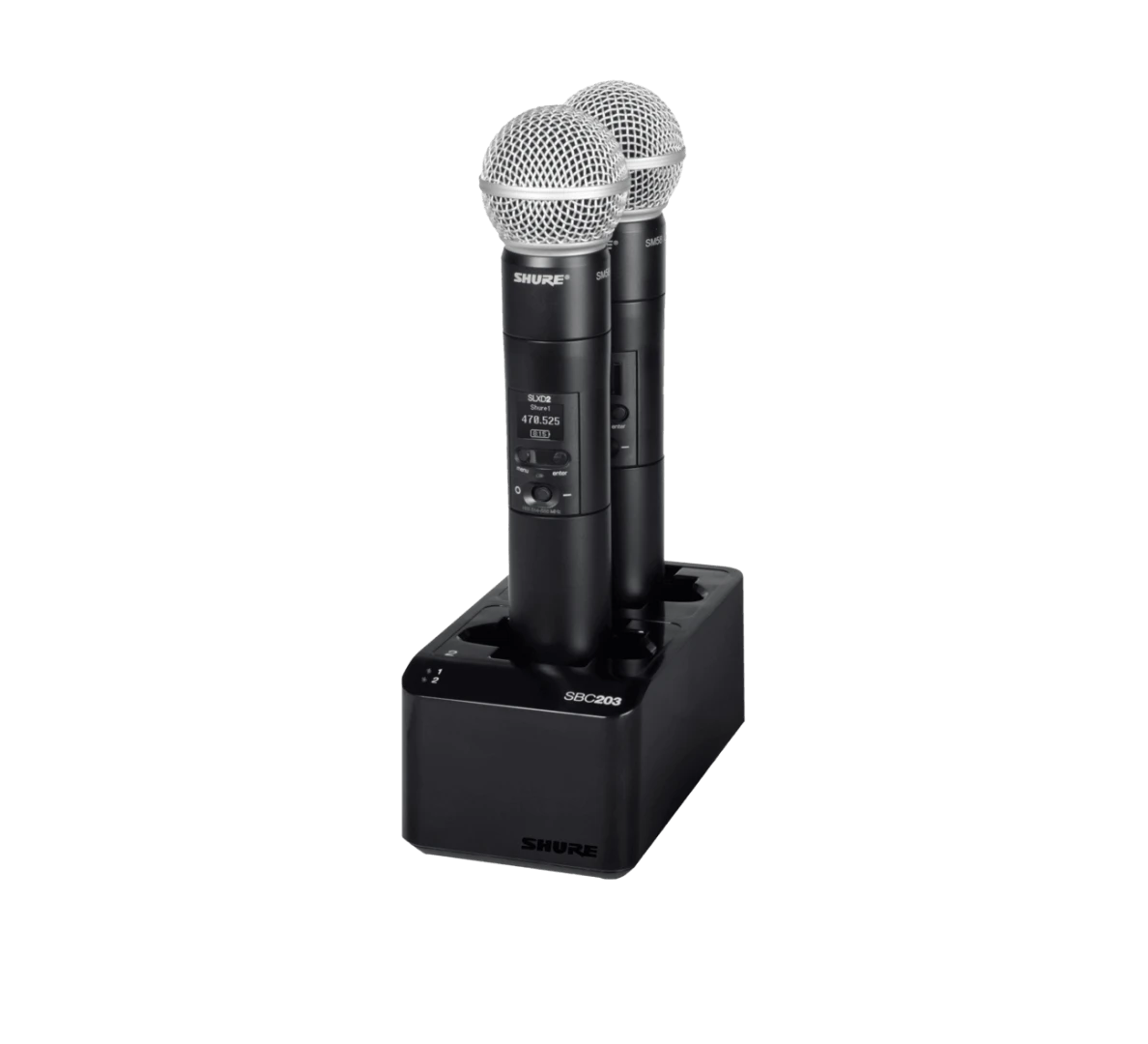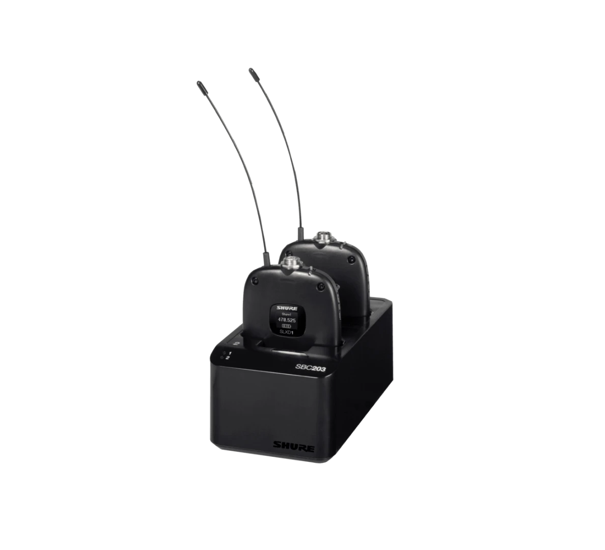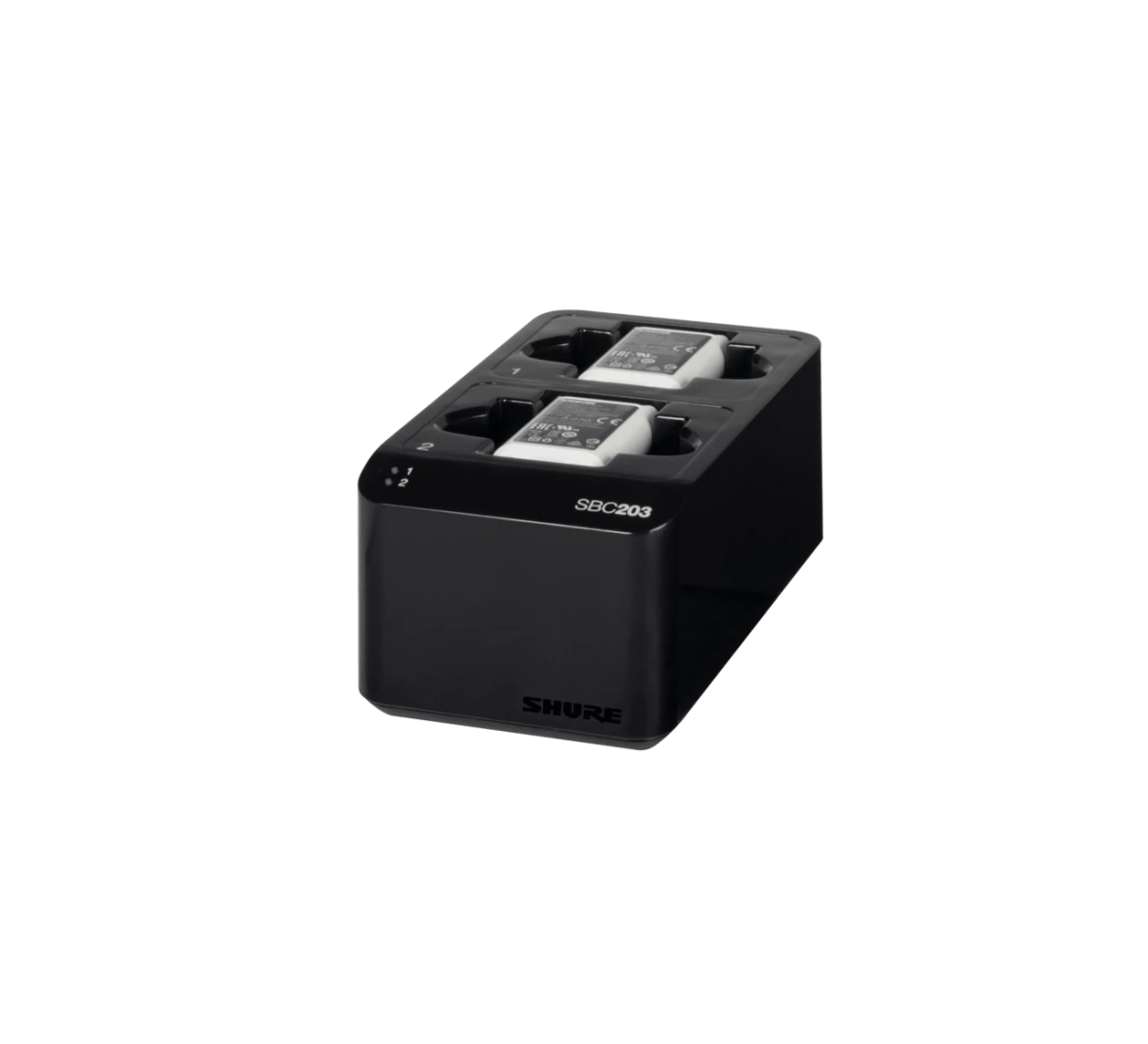 Dual docking oplaadstation laadt twee SB903 lithium-ionbatterijen. Gebouwd om twee batterijen op te laden, zowel in de hand- of bodypack zender alsook separaat