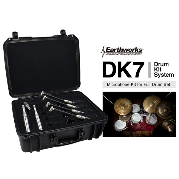 Het DK7 drumkit systeem van Earthworks is een microfoonset bestaande uit 4 DM20 cardioïde condensatormicrofoons plus 2 SR25 cardioids en 1 speciaal ontworpen SR20LS (lage gevoeligheid), die kan worden gebruikt bij zowel live uitvoeringen als studio opnames.